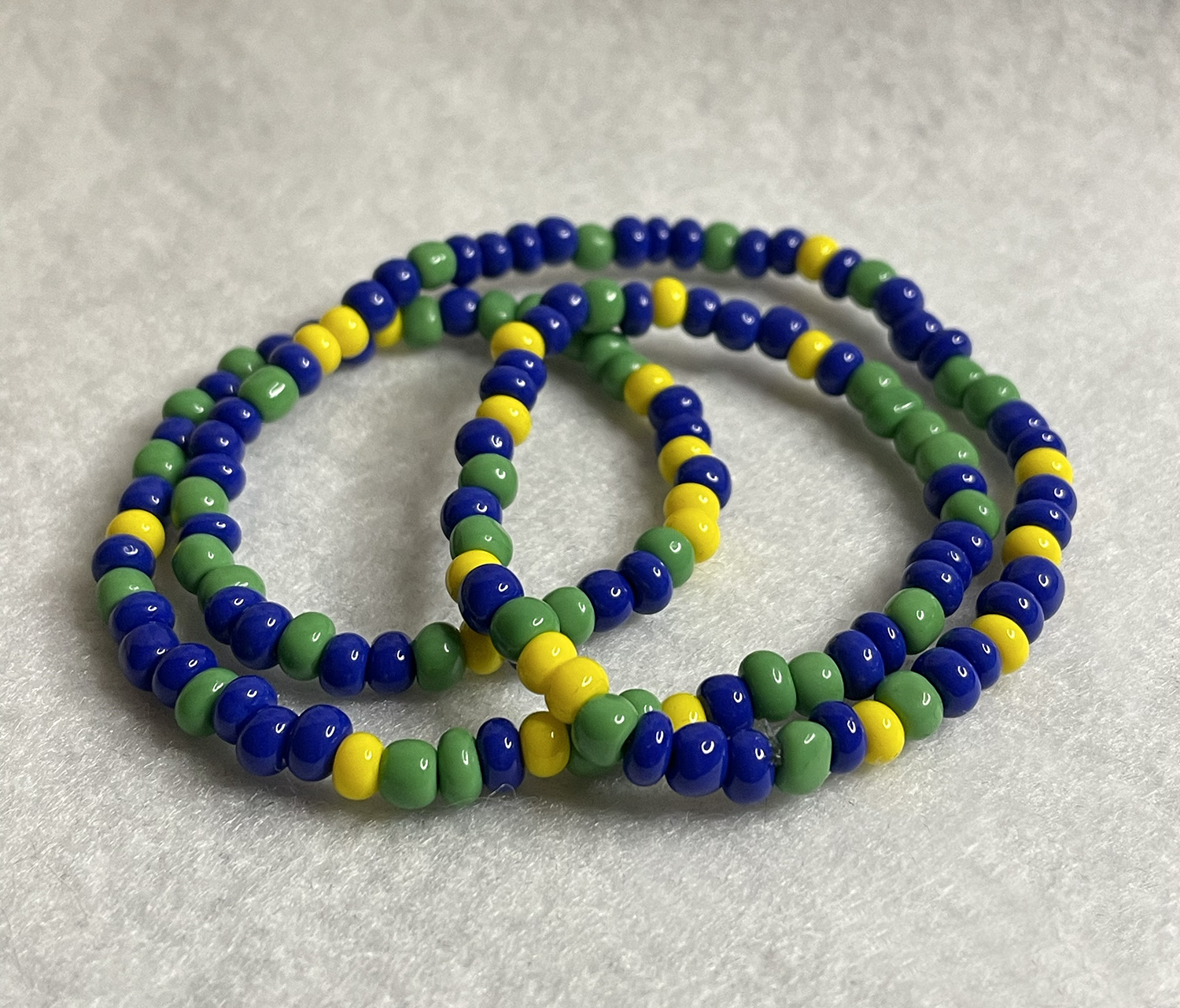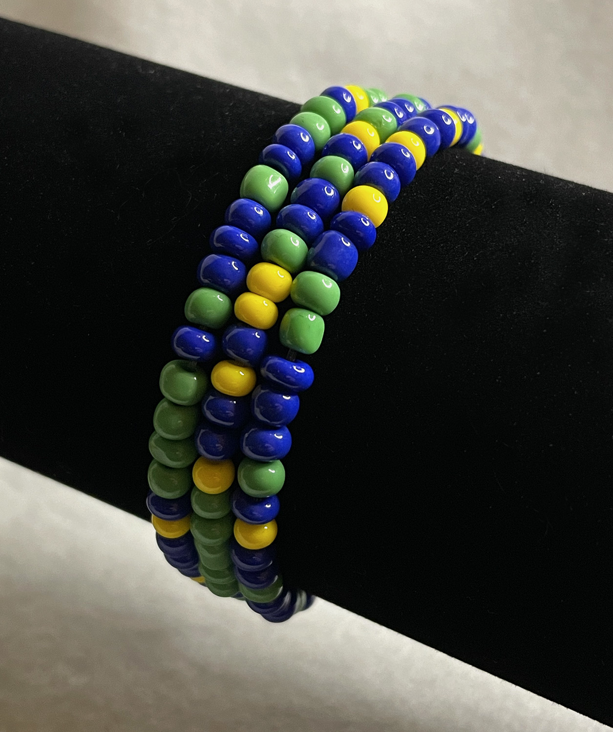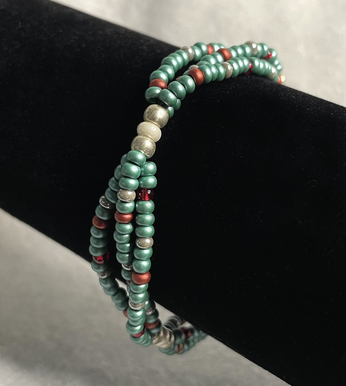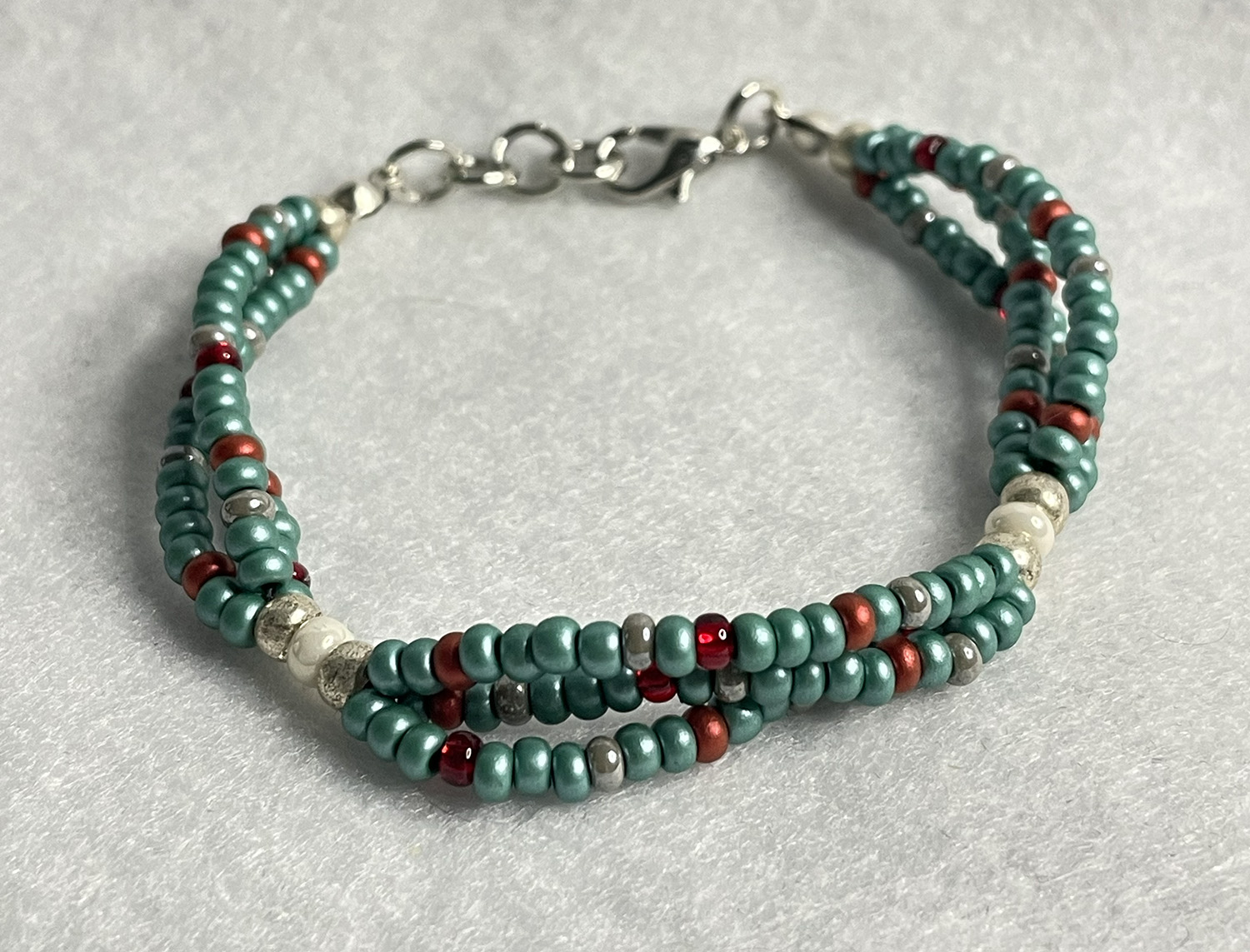 select options Bracelets Green 8/0 seed bead triple strand bracelet with gray, red, silver, pearlescent accents $22.00