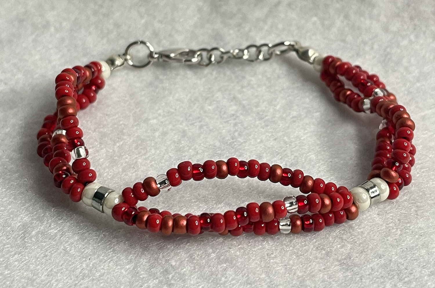 Add to cart Bracelets Red 8/0 seed bead triple strand bracelet with pearlescent and metal bead accents $22.00