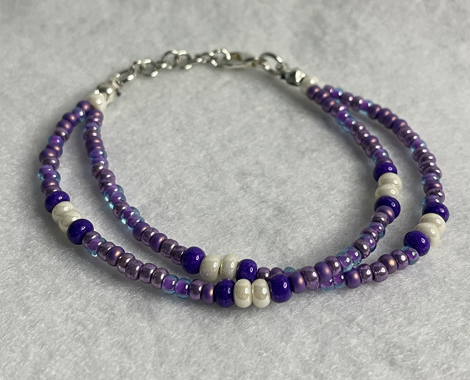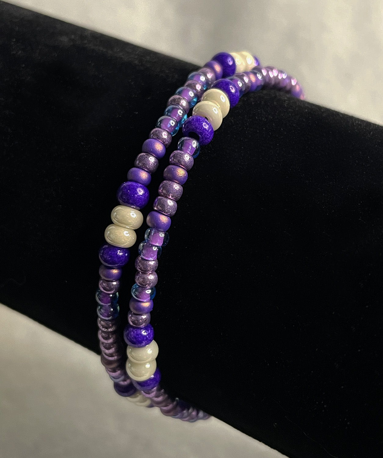 Add to cart Bracelets Double strand purple 8/0 seed bead bracelet with pearlescent accent beads $22.00
