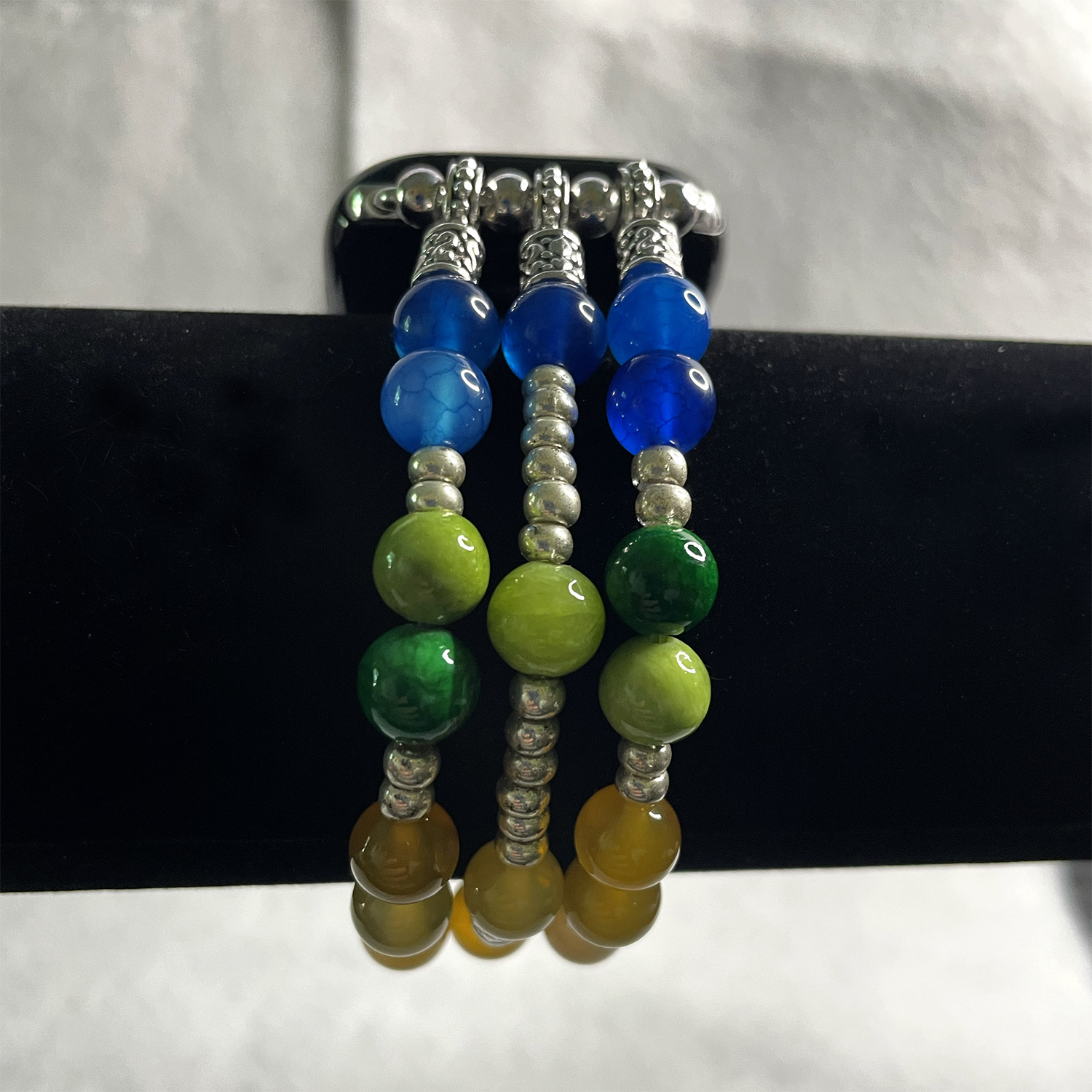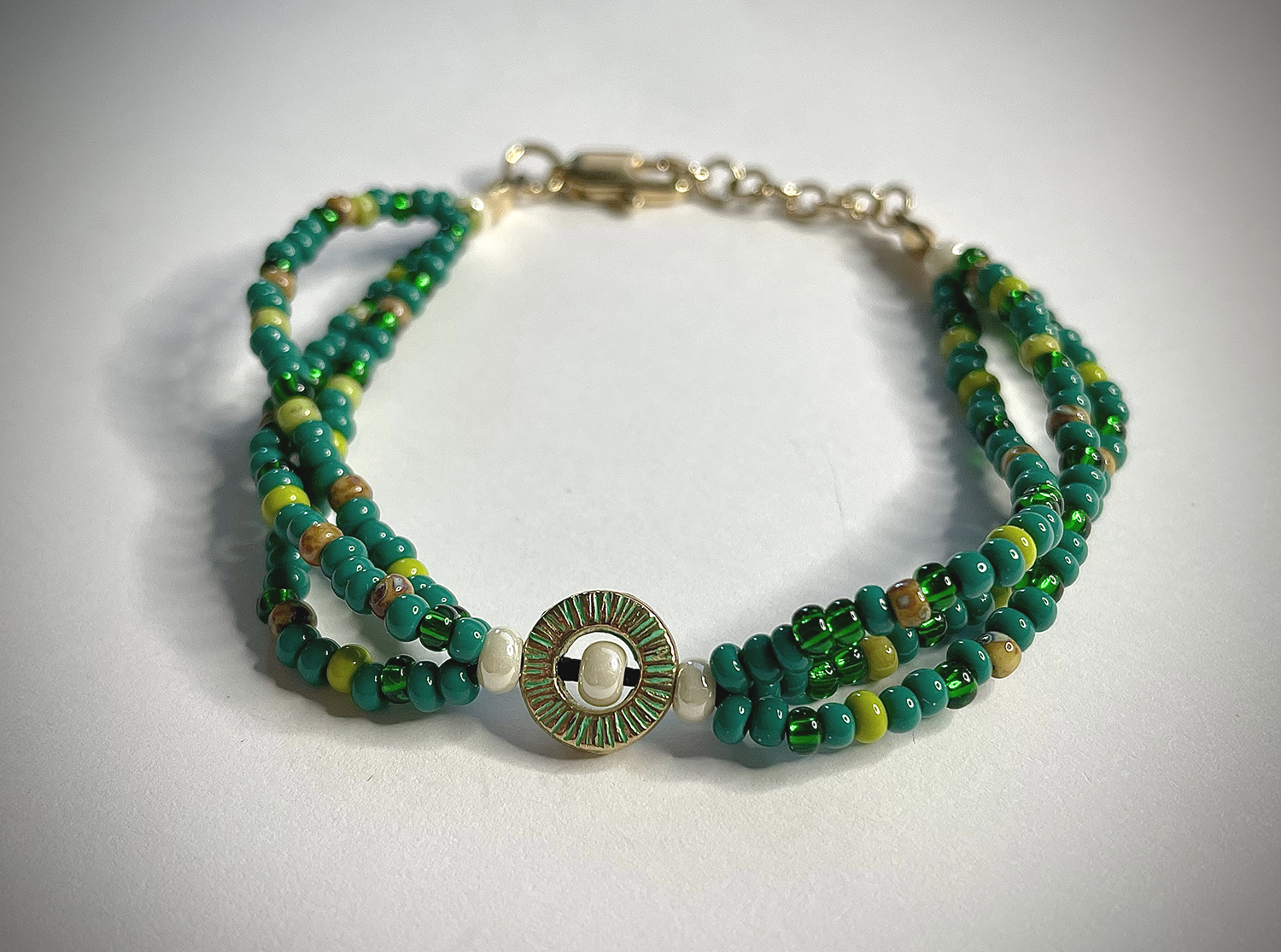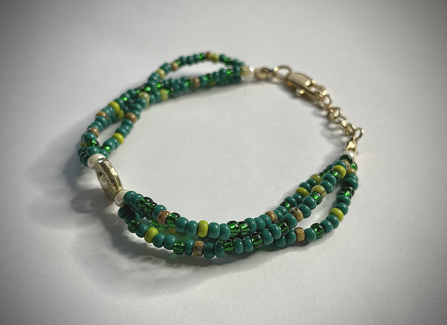 Out of Stock Add to cart Bracelets Green 8/0 seed bead triple strand bracelet with center focal piece and pearlescent accent beads