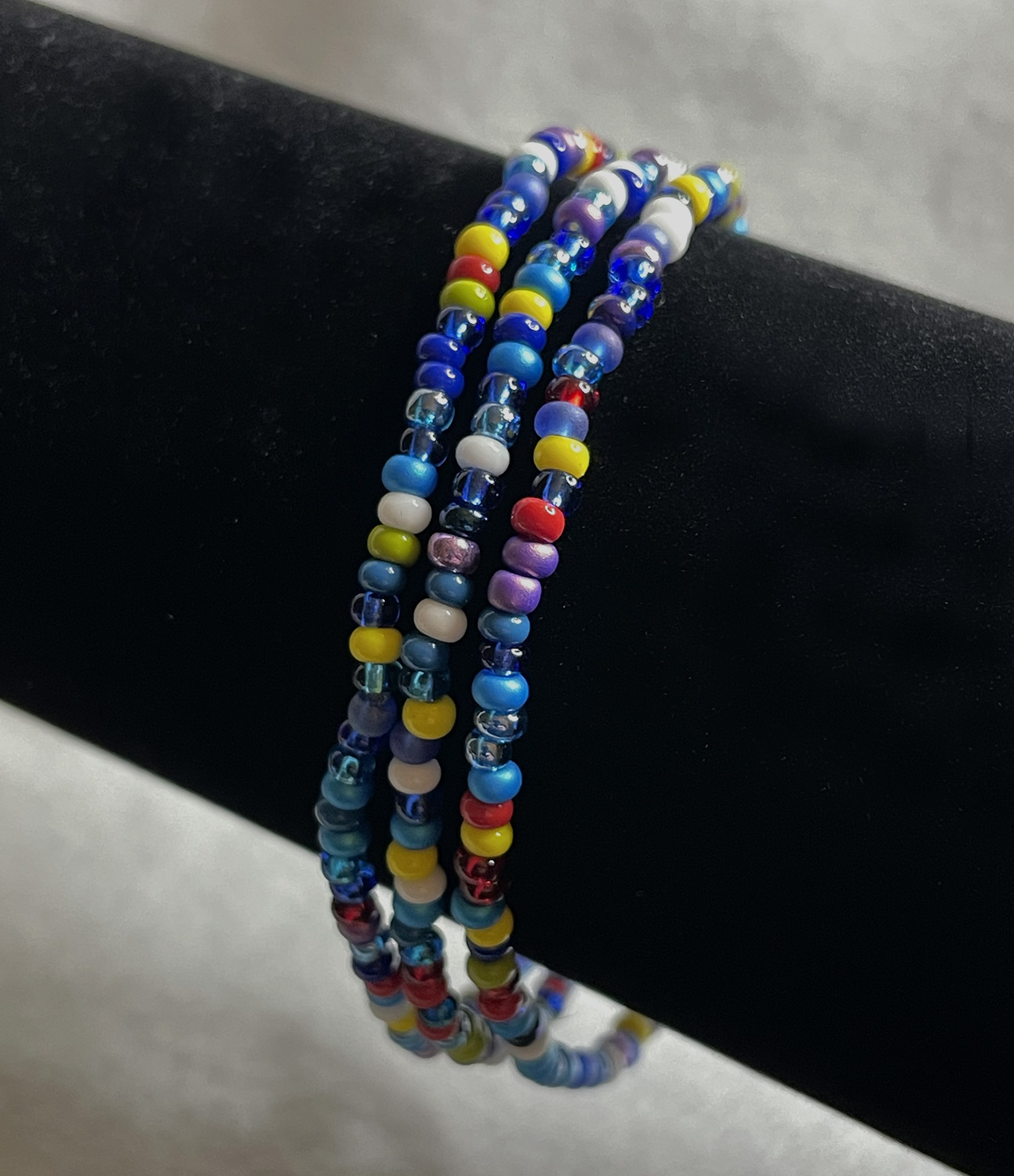 Out of Stock Add to cart Bracelets Blue 8/0 seed bead triple strand bracelet with rec and silver accents